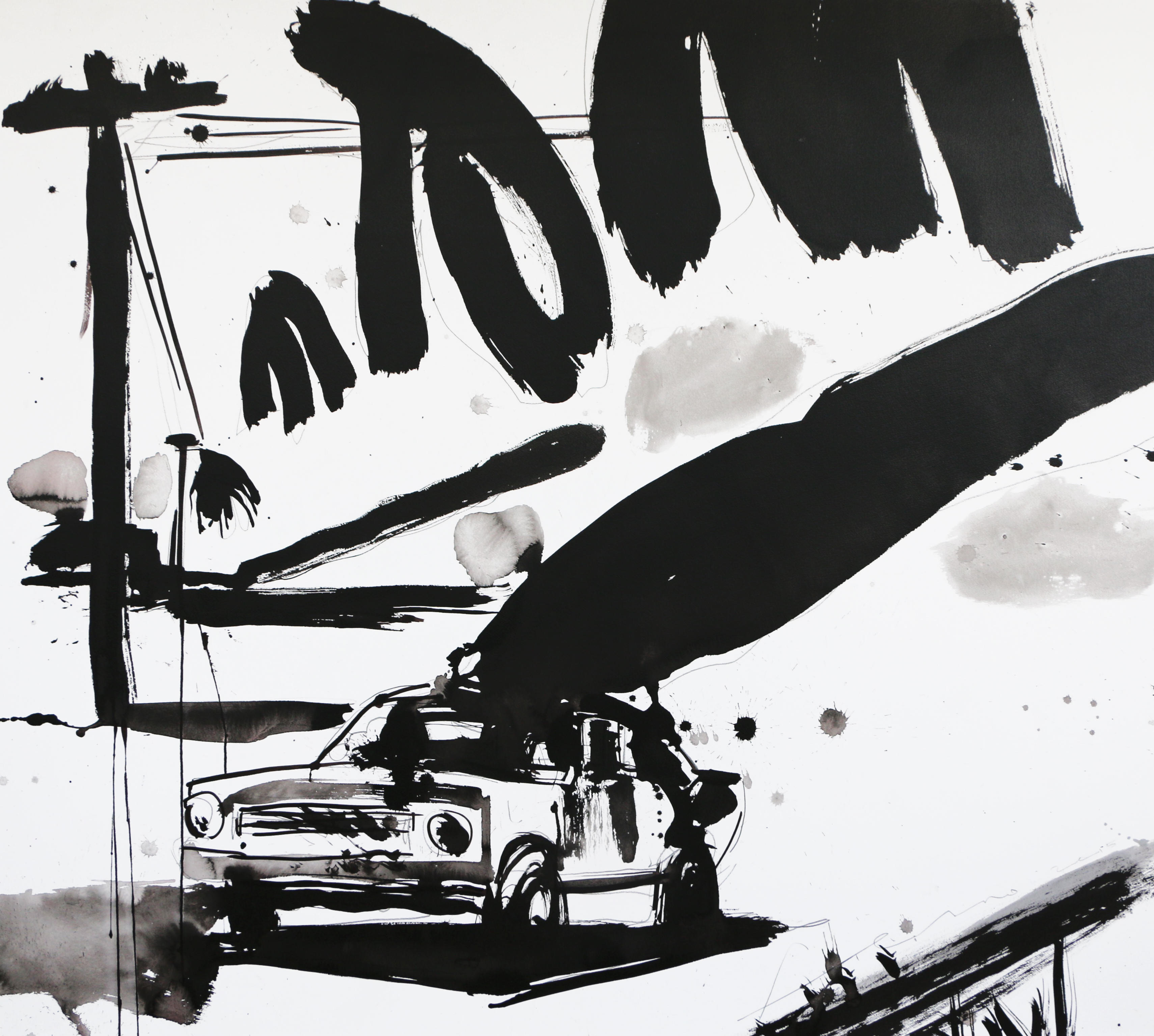 My image making has been consistently influenced by boyhood fantasies informed by pop culture revelling in images of a high-tech future: we were promised a very different world to the one we have inherited. At the centre of this glittering utopia was the car. The Sci-Fi theme is a meme from my childhood returning to vanquish Earth: outer-space squid attack an oil guzzling car in an empty landscape punctuated by electric power pole “trees”.